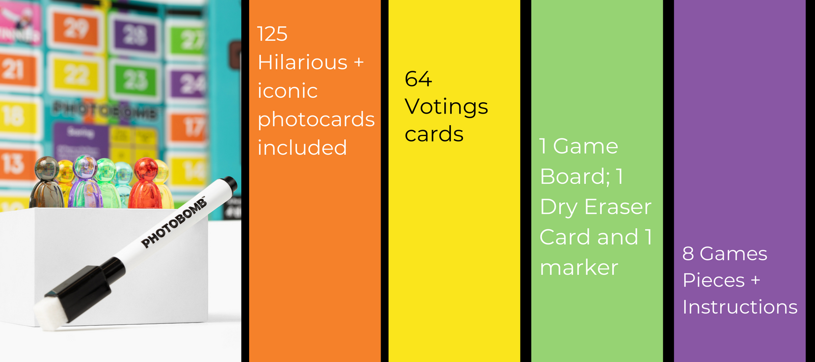 • INCLUDED: 125 iconic picture cards, 1 game board, 8 game pieces, 1 mini white board, 1 dry erase marker, voting token, and instructions!