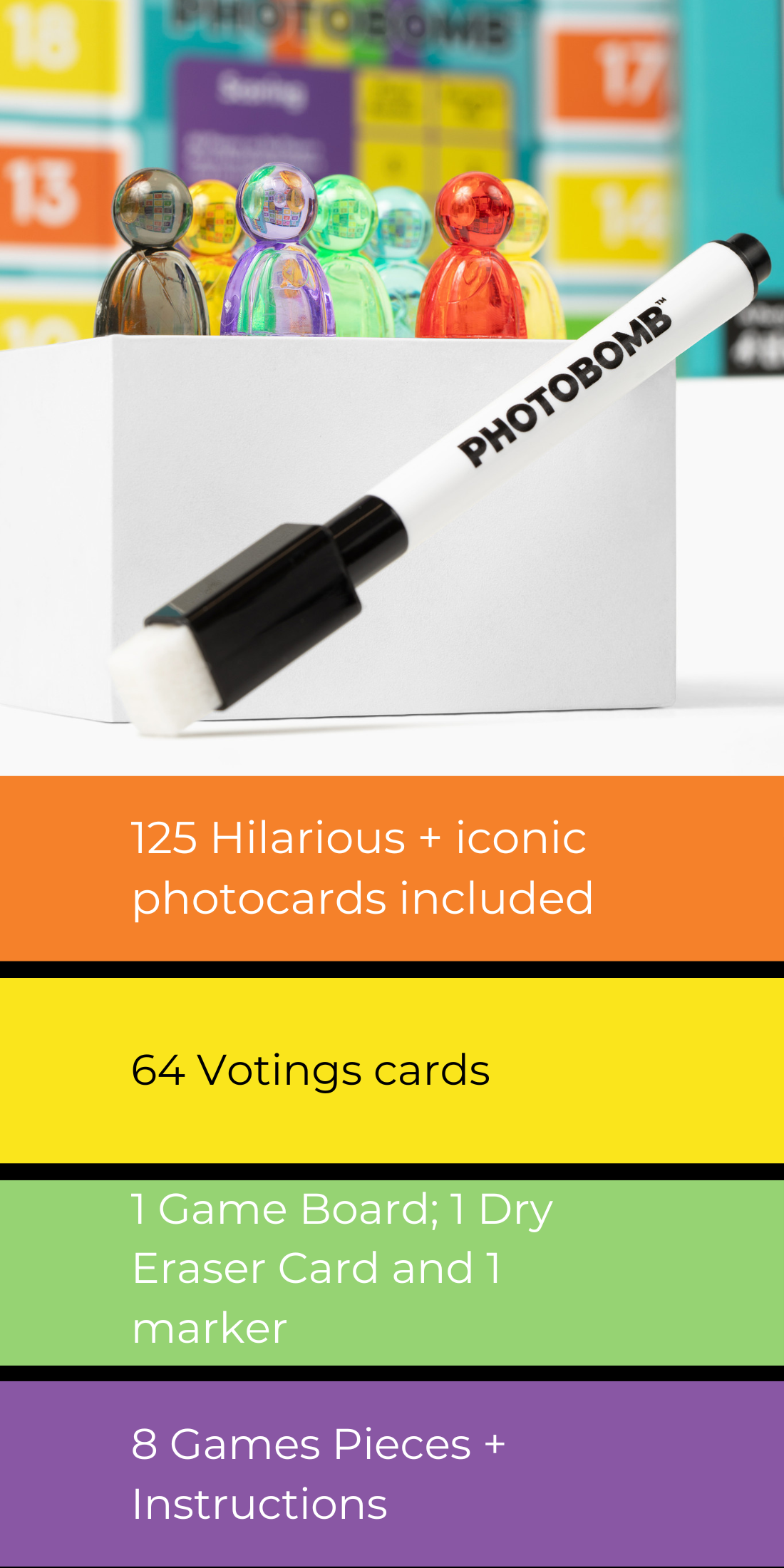 • CATCH THE PHOTOBOMBER: Nobody knows the secret image except for the photobomber, who is trying to hide their identity. You're objective is to catch the them + earn points doing so. First to 30 points wins!